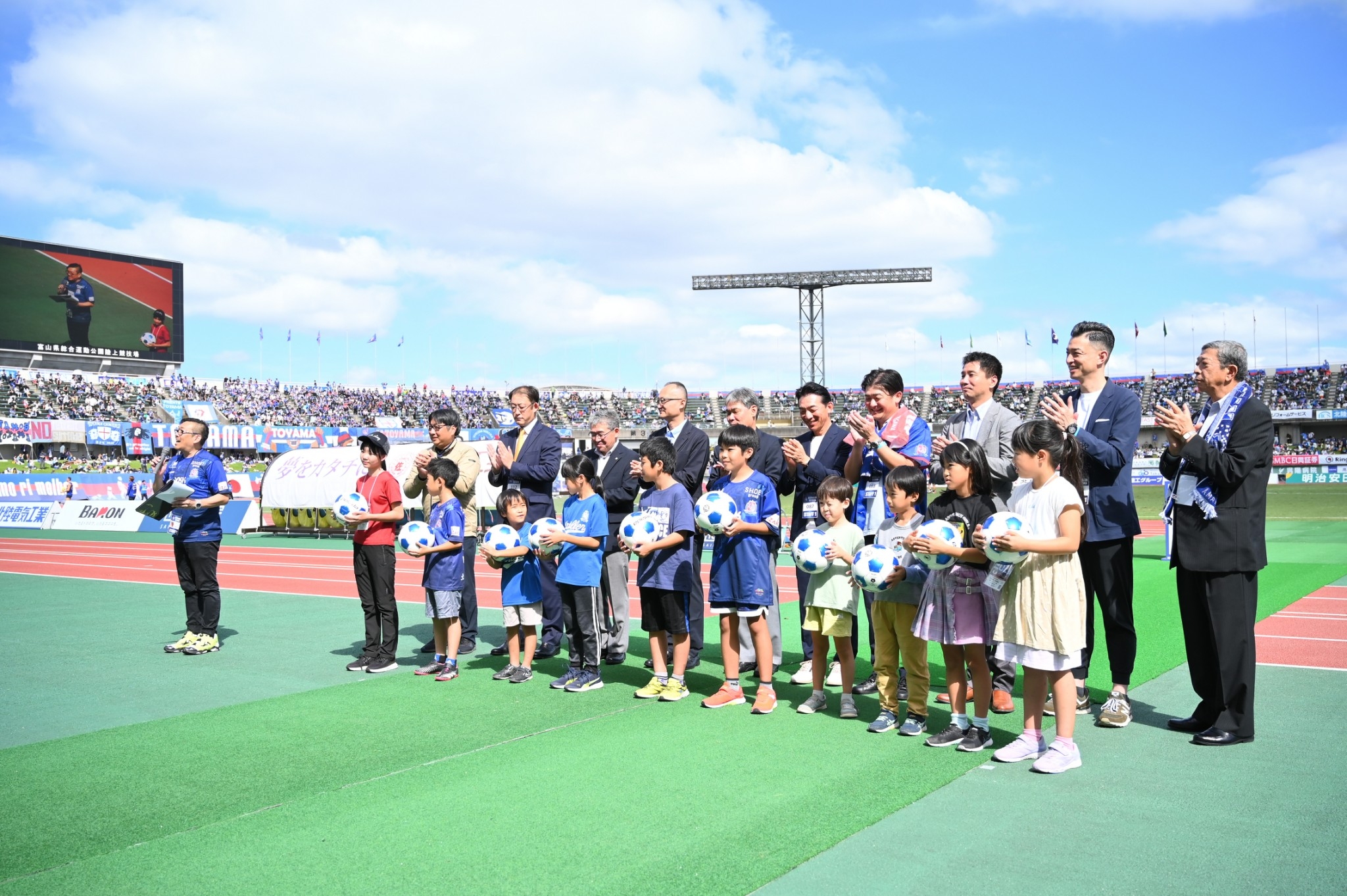 その後ピッチでのセレモニーにも参加し、他のボールパートナー様と一緒に子供たちへのボールを寄贈いたしました。
