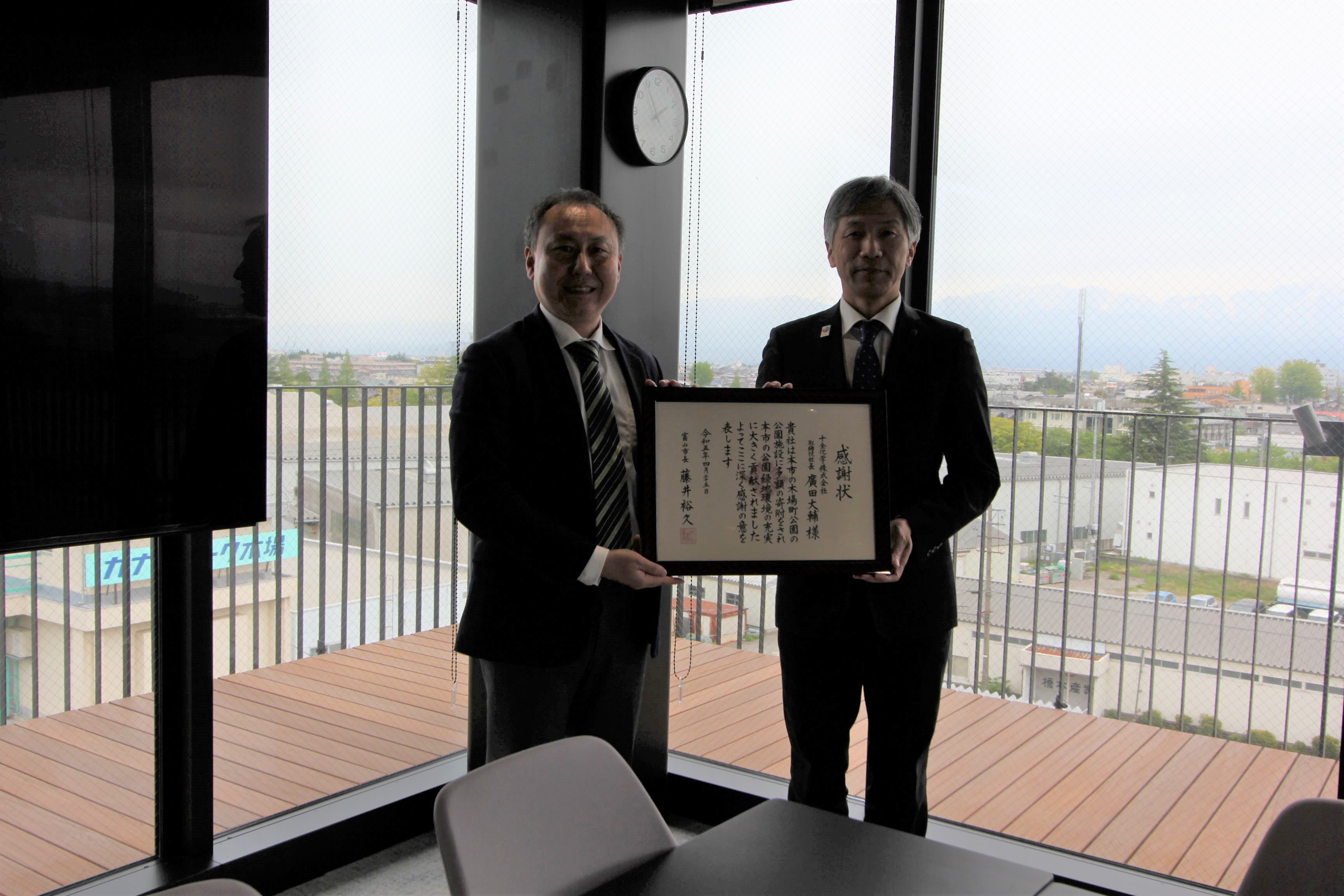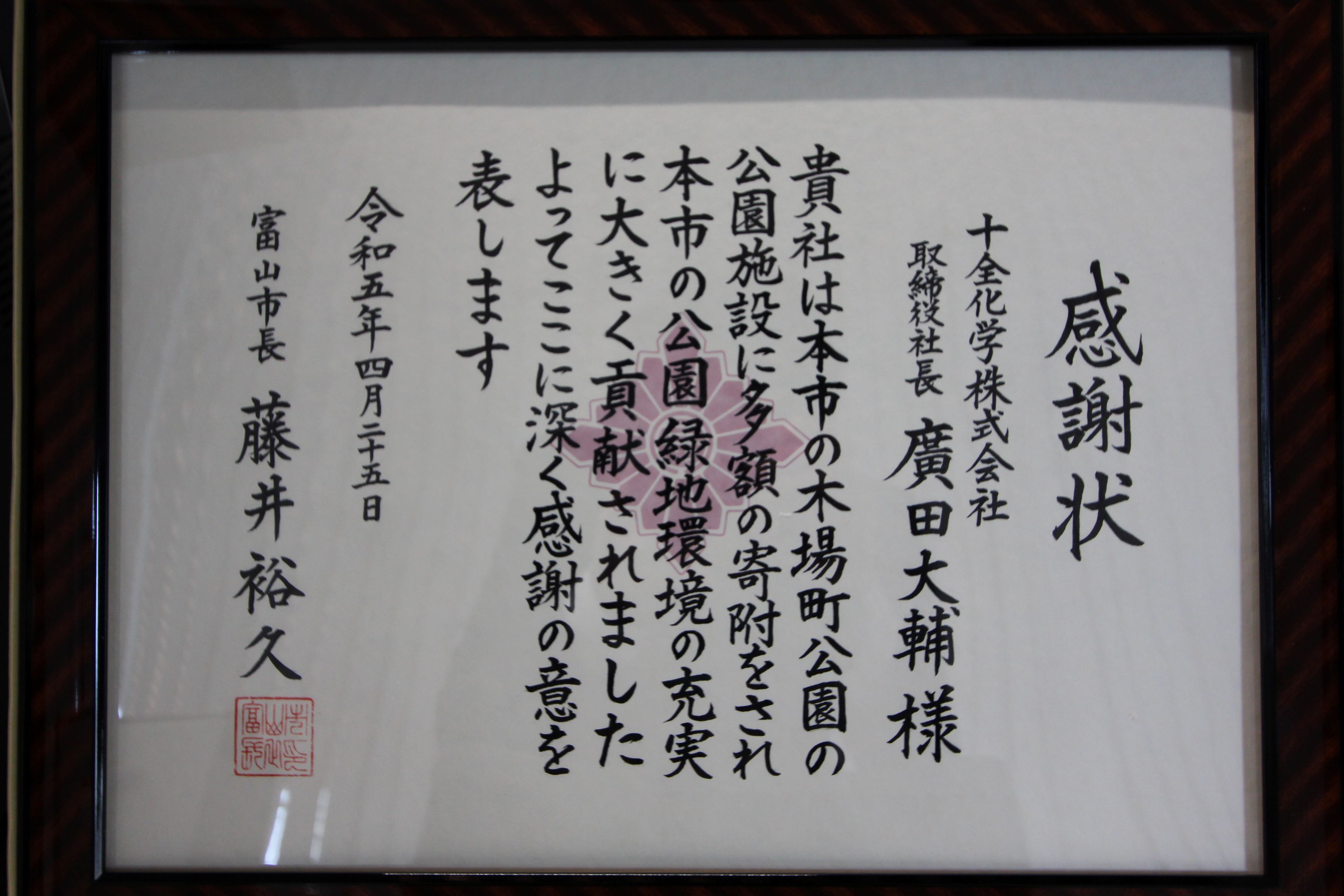 このたび十全化学株式会社は、2023年4月25日(火)に富山市より公園施設への寄付に関する感謝状を受領したことをご報告いたします。