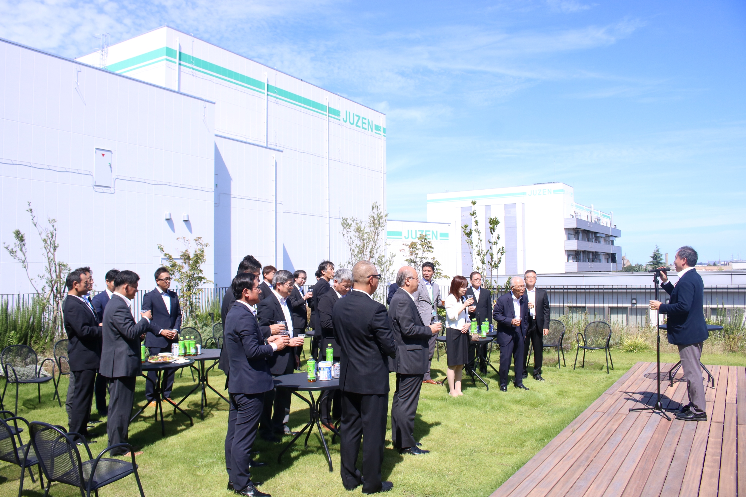 竣工式の後、新倉庫棟を望む本社屋4階テラスにて直会が催されました。